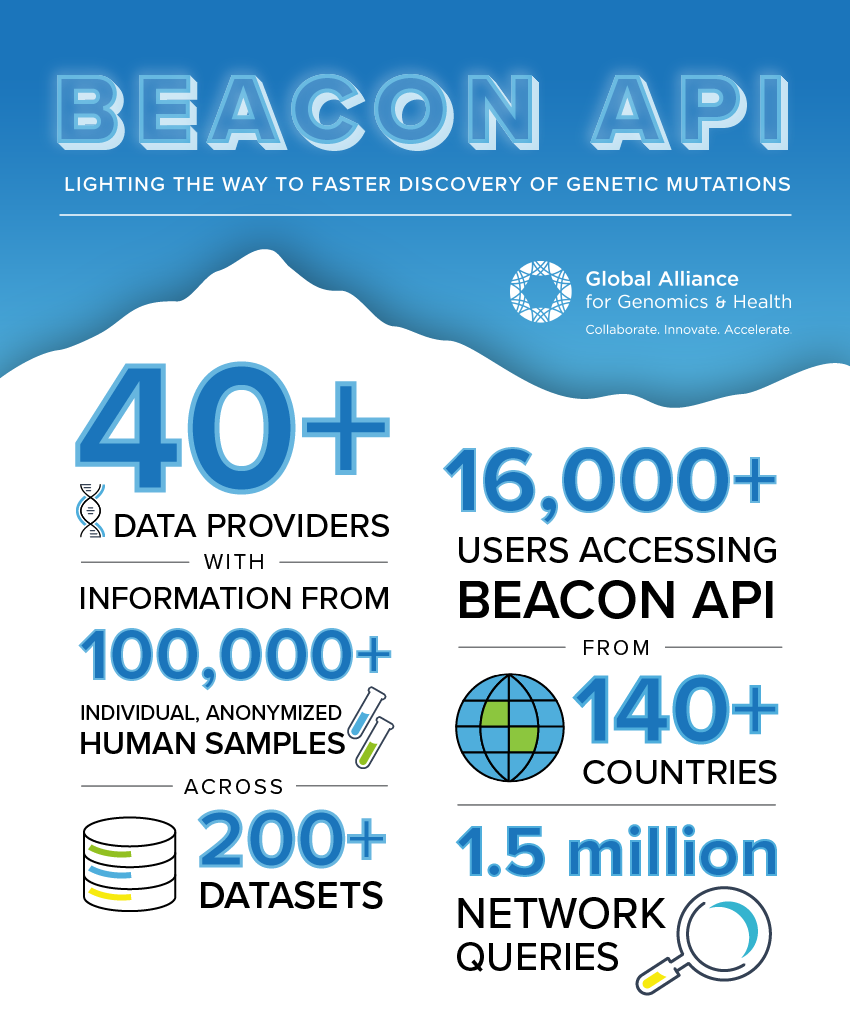 Since its inception, 42 international organizations have used the API to serve data from >100,000 individual, anonymized human samples across 200 datasets — including the NIH dbGaP, European Genome-phenome Archive (EGA), and the European Variation Archive (EVA) — discoverable to the clinical and research communities. The Beacon Network (beacon-network.org), a distributed search engine across the world’s public Beacons, has been queried 1.5 million times and has grown into an internationally relevant resource for easing data discoverability.